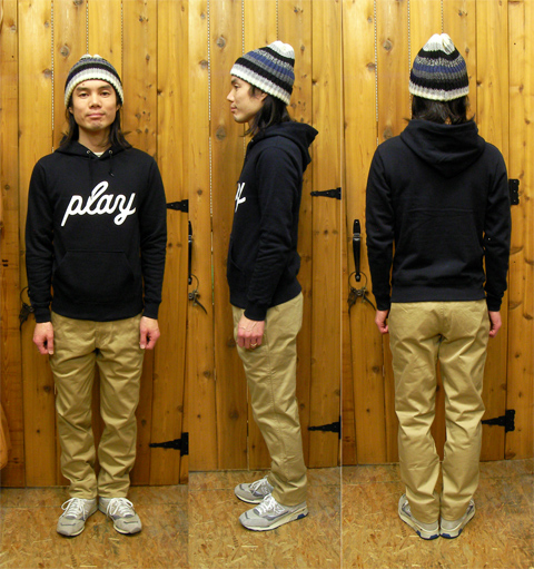 本日ご紹介させて頂きますP01(プレイ)のパーカもそんなところです。やや薄手のスウェットは春先まで重宝する一枚。タイトなシルエットなので重ね着にも容易に対応可能なスグレモノは、シンプルに筆記体で「PLAY」とロゴが入ったスウェットパーカ。そのなんでもないようなところが「ふつう」でええのです。はい。