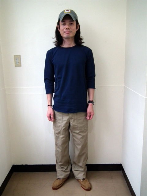 ●7分袖 Spinner Bait(スピナーベイト) ミニ裏毛7分袖 カラー:ネイビー サイズ:38、40(着用)、42、44 プライス:¥6,090-