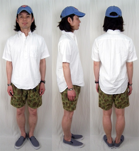 まずはこちらでございます。ベーシックなオックスフォードは被りの半袖シャツでございます。身幅にゆとりのあるプルオーバーは夏らしくていいですね。涼しげでございます。半袖シャツといえば、被りのボタンダウン。オックスフォードホワイトとブルーシャンブレーは是非押さえておきたい定番!スタンダードアイテムでございます。