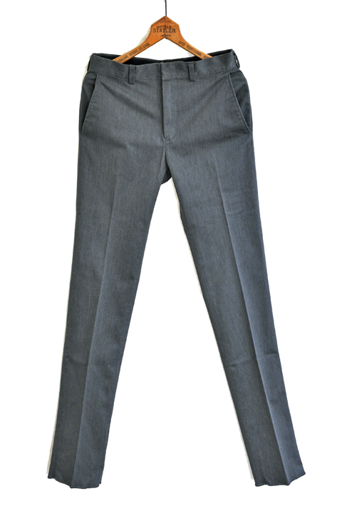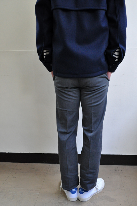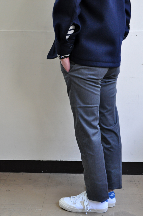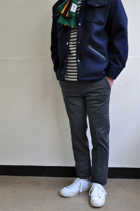 細めのスラックス。しかも伸び伸びストレッチですから、細めで見た目にシュっとしてるとはいえ履き心地は最高!めちゃくちゃ快適!!楽チンなスラックスなのでございます。恐るべしストレッチ効果。そして色目はグレーのみでございますから、スニーカーにカットソーだったり、レザーシューズにタイドアップしてもまとまります。カジュアルにもドレスにもバッチリ!オン・オフ対応のスラックスではないかと思います。