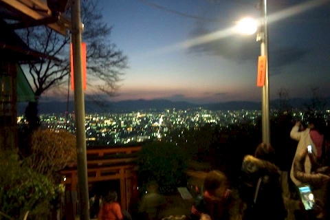 のんびり昼くらいに向かいましたので、山頂に着く頃にはとっくに日没。しかし夜景は綺麗でした。初めて訪れたのですが、思った以上に登る登る…。若干息を切らしながら、一番上まで登ってお参りをして来ました。下りは楽チン、あっという間に麓に帰り着き、後は夜店で買い食いして楽しみました。