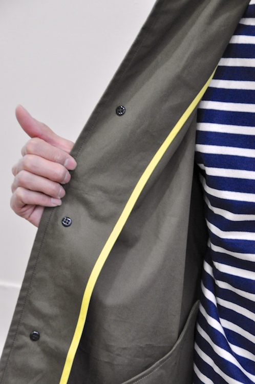 黄色いパイピングが洒落てます。裏ボタンと言うところがまたシブい。