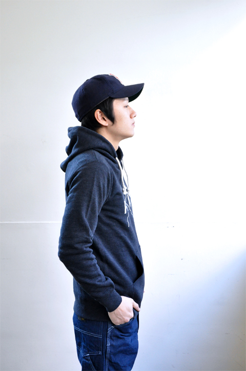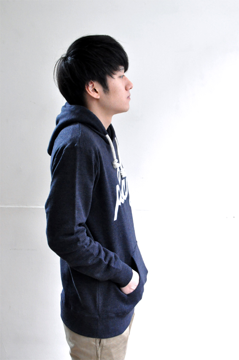 プリントや小さなロゴマークもさることながら、個人的にはフードのちょい太目の紐がいいアクセントだと思います。