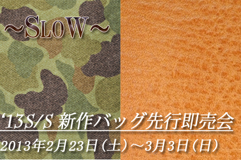 来る2月23日(土)より『SLOW(スロウ) ’13s/s 新作バッグ即売会』を開催させて頂きます。