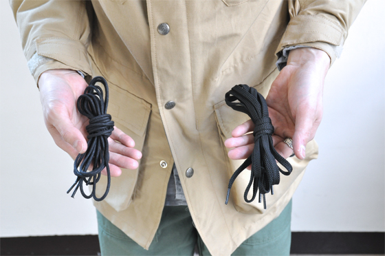 付属の靴紐の他に、本体と同色の丸紐、平紐がそれぞれ付いていますので付け替えてお楽しみください。
