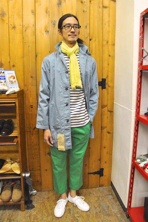 とある日のZABOU。 spinpants1  暖かくなったらどんな服を着ようかな?だいたい毎年同じ事を考えるのですが、その考える気持ちの大小が、年によって違います。「まあひとまず、去年買ったあれでいっか。」と思う事もあれば、「今年はめっちゃ買わなあかんなぁ〜っ。」ってな時も。結局、毎年たくさん買ってはいますが。笑  服の楽しみは毎日のちょっとしたワクワクです。ただそれだけです。そんなシンプルな楽しみが、今の複雑な世の中に必要な気がします。単純て、ストレートで良いじゃないですか。例えば、昨日洗ったリゾルトのジーパンが乾いてるはずだから、明日穿くの楽しみだな〜、とか、単純極まりないけど、これって本当に幸せな事です。  『必要か、不必要か』と問われれば、僕には服が必要です。服は服よりも大切な事をたくさん教えてくれます。だから僕にとって服は大切です。  本日は『N.O.UN(ナウン) SPINDLE PANTS』をご紹介致します。  半端丈のイージーパンツです。しかし、ナウンのパンツはそうイージーにはいきません。 55606441 55608646N.O.UN(ナウン) SPINDLE PANTS  カラー:グリーン、レッド  サイズ:1、2  ¥10,290-  ご覧の通り、むっちゃ派手です。笑 しかし、穿いてみれば意外とアリ。適度な刺激で新鮮さを味わえます。  スポーツウェアを思わせる、スッキリとスポーティなシルエットそして雰囲気を持っています。しかし素材はコットン×ポリエステルと、ワークウェア御用達の丈夫素材。物足りないくらい引き算されたデザインに、大きなバックポケットが印象的。左足脇には、ナウンお得意の隠しポケットもございます。 spinpants3●コート SHOPPING PAPA2 ZABOU special サックス  サイズ:3着用  プライス:¥25,725- ●カットソー Saint James(セントジェームス) REVERSIBLE BORDER ECRU×MARINE(生成り×マリン)  サイズ:4着用  プライス:¥13,440- ●マフラー みやざきタオル いまばりマフラー70 おみなえし  プライス:¥1,365- ●パンツ N.O.UN(ナウン) SPINDLE PANTS  グリーン  サイズ:1着用  ¥10,290- ●スニーカー SUPERGA(スペルガ) キャンバススニーカー ホワイト  サイズ:42着用  プライス:¥7,140- 身長180cm、体重56kg、足のサイズ約28cm spinpants2●ジャケット Loquat Sports Wear (ロクァットスポーツウェア) Stretch 2B Jacket(ストレッチ2つ釦ジャケット)  サイズ:L着用  プライス:¥19,950- ●シャツ Loquat Sports Wear(ロクワットスポーツウェア) ボタンダウンシャツ ロンドンストライプ ブルーグレー  サイズ:M着用  プライス:¥11,025- ●パンツ N.O.UN(ナウン) SPINDLE PANTS  レッド  サイズ:1着用  ¥10,290- ●レザーシューズ G.H.BASS(ジーエイチ・バス) LEVERETT ペニーローファー black  サイズ:8,5着用  プライス:¥14,490- 身長180cm、体重56kg、足のサイズ約28cm  ジョギングパンツかワークパンツか、はたまたシンプルにカラーパンツか…捉え方は様々ありそうです。コーディネートでかなり遊べそうですね。是非、お試し下さいませ。 ナウンのパンツ、良いね!必要! ☆試着しに行くZABOU のお店 ☆ウェブショップで詳しく見てみるZABOU WEB SHOP