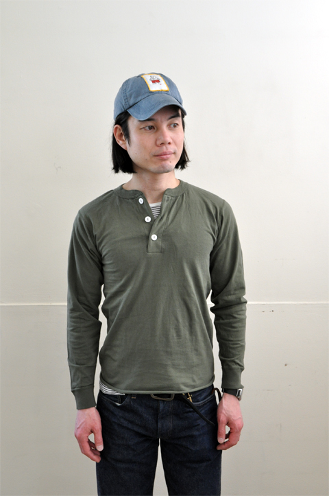 Healthknit(ヘルスニット) 3つボタンヘンリーネック長袖Tシャツ カラー:オリーブ サイズ:M、L、LX プライス:¥4,095-