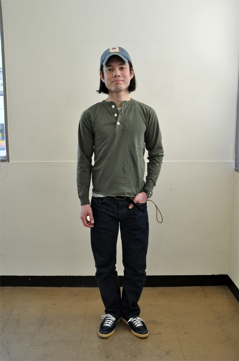 春のスタイルにはシャツのインナーに映えますね。シャンブレーのワークシャツやアーミーシャツ、G-ジャンなど男くさいものの方が雰囲気が出る。5.4オンスのアメリカ綿(USA Cotton)ですからね~。タフなアイテムをラフに着るに限りますね!