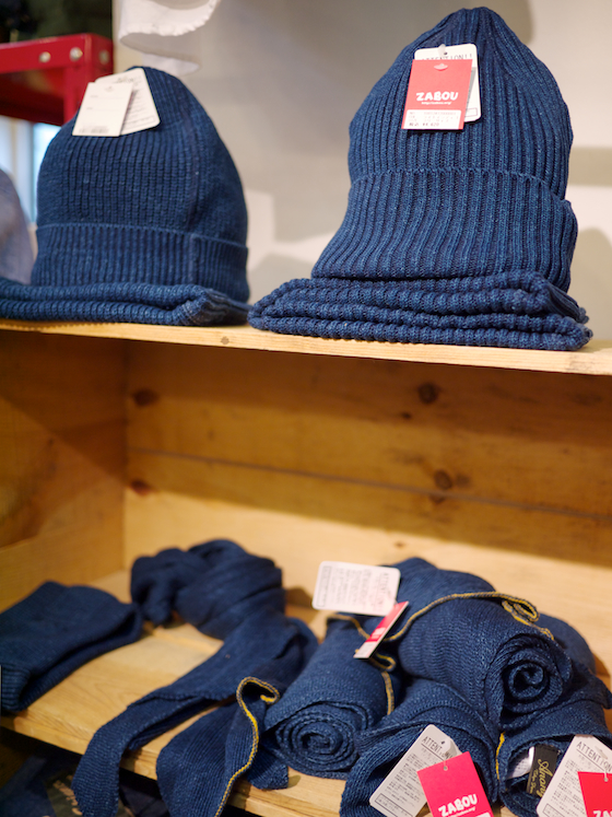 インディゴ染めのキャップ、ストール、ヘアバンド。