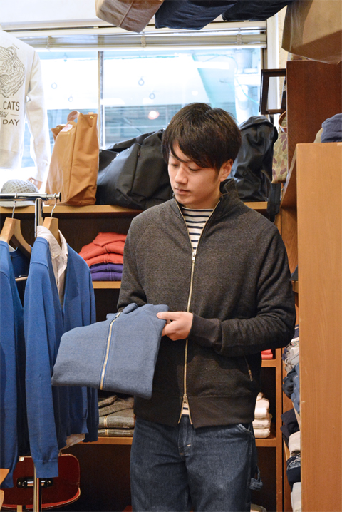 薄手のスウェット素材を使用した春に丁度いい羽織り物。スタンドカラー、ダブルジップとシンプルながらしっかりサマになりますよ。