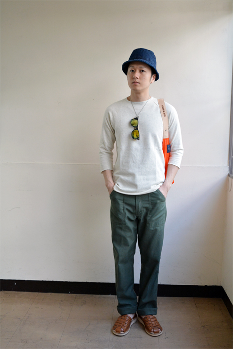 肌あたりが気持ちいい人気のミニ裏毛。袖口と裾がロック仕上げで外側にクルッとまるまるのがいいアクセント。サングラスに発色のいいナイロンバッグで初夏のレジャーにもおすすめです。
