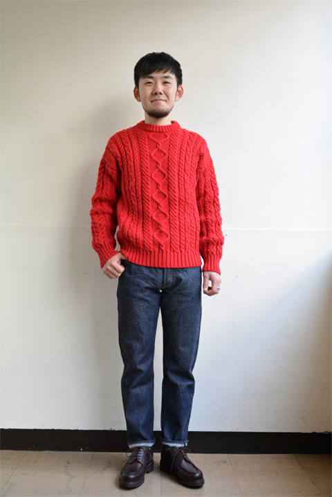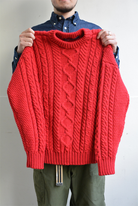 【GUERNSEY WOOLLENS(ガンジーウーレンズ) ARAN PATTERN CREW NECK SWEATER スカーレット】