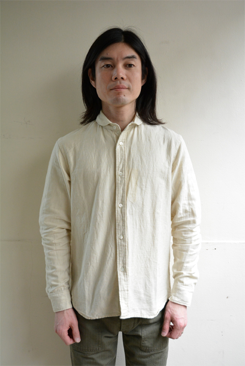 デッドストックの古い生地を使用した、シンプルな丸衿のシャツでございます。