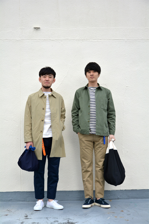 持ち手がコットン、袋部分はナイロンのツートン。大きいサイズと小さいサイズ。素材と縫製は日本製。デザイン性だけでなく使用感に実用性が備わった、この春おすすめのバッグスタイルでございます。
