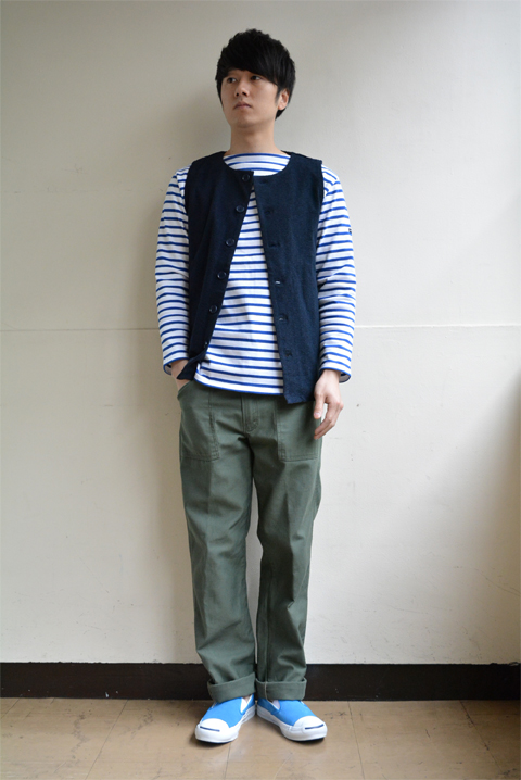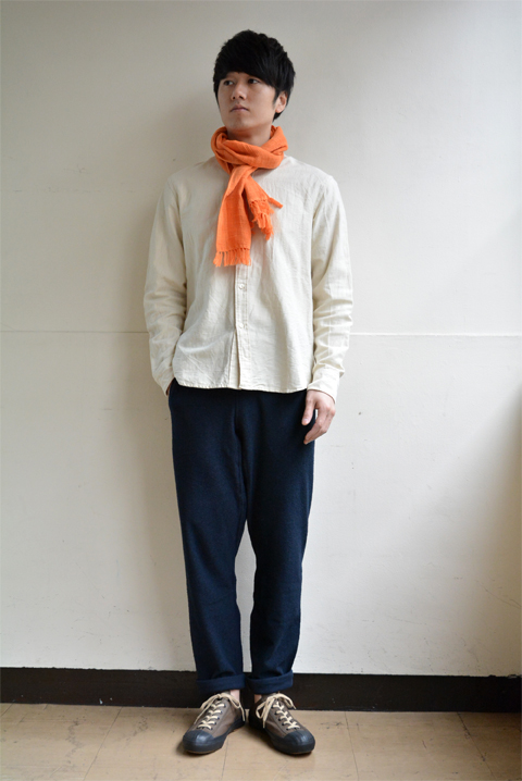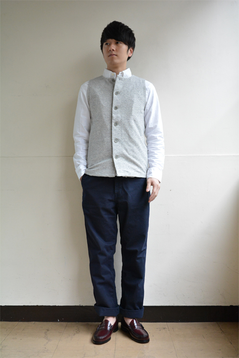 シャツやカットソーの上に羽織って雰囲気良く、また上から何か羽織るときも襟元がすっきりとしていいですね。