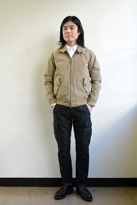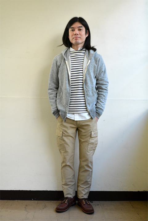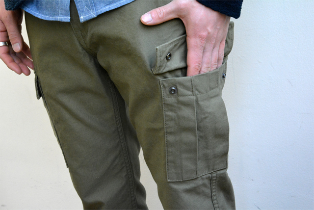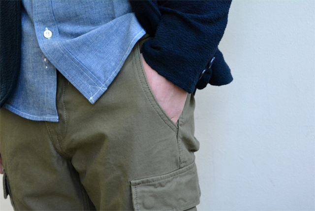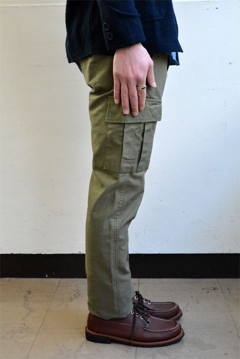 気分でもあり自分好みのミリタリーパンツ。本来なら太めのストレートシルエットのカーゴパンツも現在の気分に置き換えてシュッとキレイなテーパード。僕の中ではミリタリーパンツは太くて当然、男臭い方がイケてるって思ってましたが、このパンツは新鮮でおもしろい、尚且つシルエット良く穿けるんで良いですね!