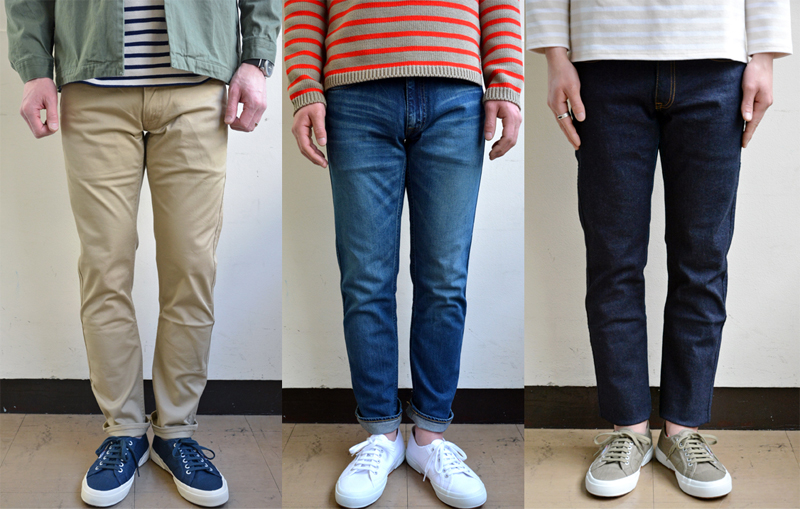 細めのスリムテーパード。足長効果のあるシルエットです。また股上が少し浅めです。あらかじめ短めに設定されたアンクル丈はロールアップをして穿く事を考えたレングスにしています。
