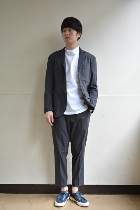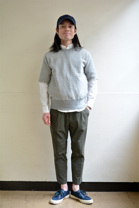 コーディネートは、ボリュームの押さえた例えばスペルガなどのローテクスニーカーがしっくりくる。