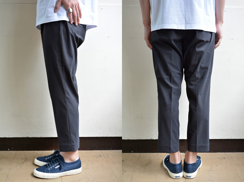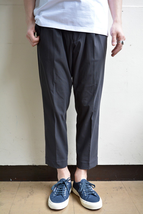 縫製工場泣かせの伸縮性。縫うのが難しく依頼を断られること数知らず、そんなスーパーストレッチは、肌にサラッと快適な触感があるナイロン/ポリウレタン素材の快適パンツです。1タックでスピンドル付き。腰回りに程良いルーズ感を保ちながら膝下から細くなるクロップド丈のテーパードは、今最も旬な気になるシルエット。
