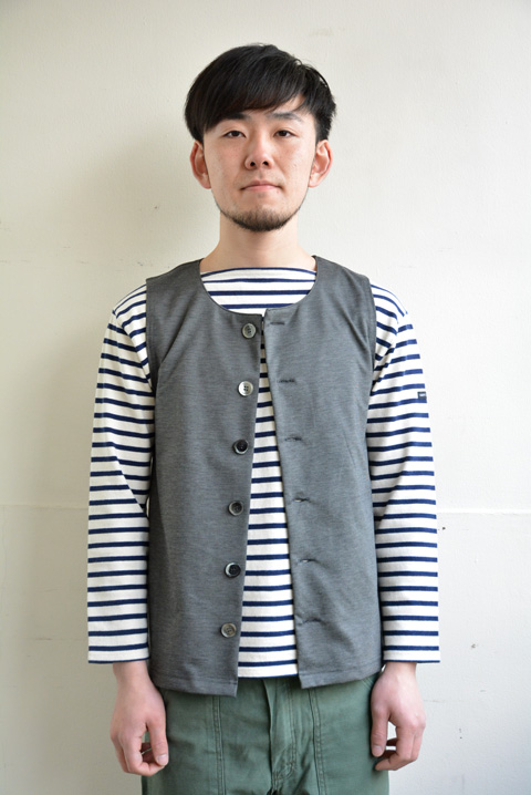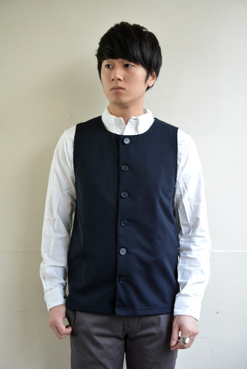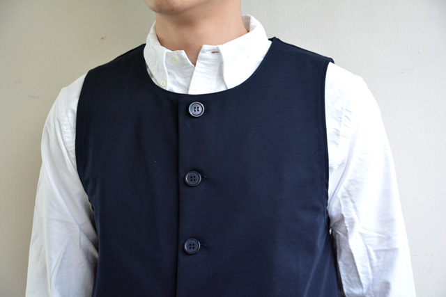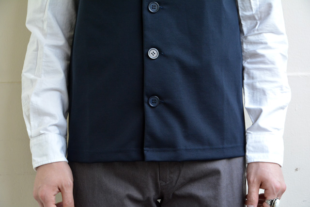 同じ素材を用いたベストもございます。襟元はVネックではなくクルーネック。ここにまた遊び心を感じさせます。