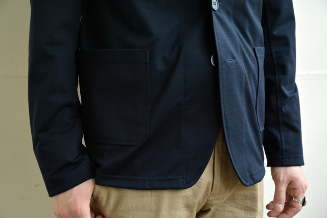 ベーシックなもので着回しもしやすい、それでいて少し遊び心があるSPINNER BAIT(スピナーベイト)。ちょうどエエのん見つかりました。伸縮性のあるモクロディ素材というものを使用。軽くて伸びるから着心地も快適で抜群。生地の見た目には少し上品な光沢感が。三つボタンにパッチポケットにちょうどいい大きさのラペル。テーラードジャケットのような落ち着いた大人の雰囲気。これなら少しカチッとした場でも、普段着にもマッチしそう。