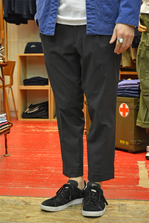 タックが入っているので腰回りにはユトリがあり、裾に向かったテーパード、クロップド丈ととても気分な形ではないでしょうか。