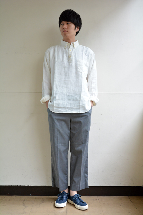 足元はスペルガのようなローテクスニーカー、バスのローファーなどコンパクトなシューズで合わせてあげるのが好きなバランス。
