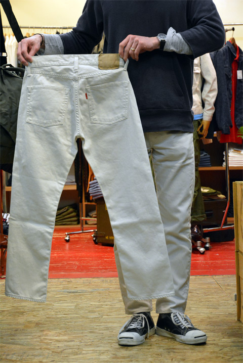 ジーンズも大好きです。久しく穿いてなかった白っぽいジーンズがまた穿きたくなった。サテンかデニムの白っぽいのは良く穿いてたけどピケの白っぽいのは案外初めて。春から夏に穿くジーンズとしては丁度いい素材ですよね。お陰様で残り僅かとなりましたが、今月末には待望の入荷があるかもです。