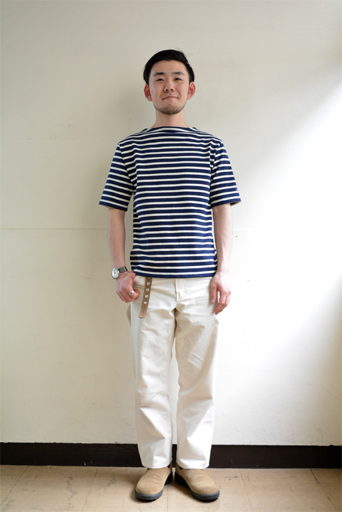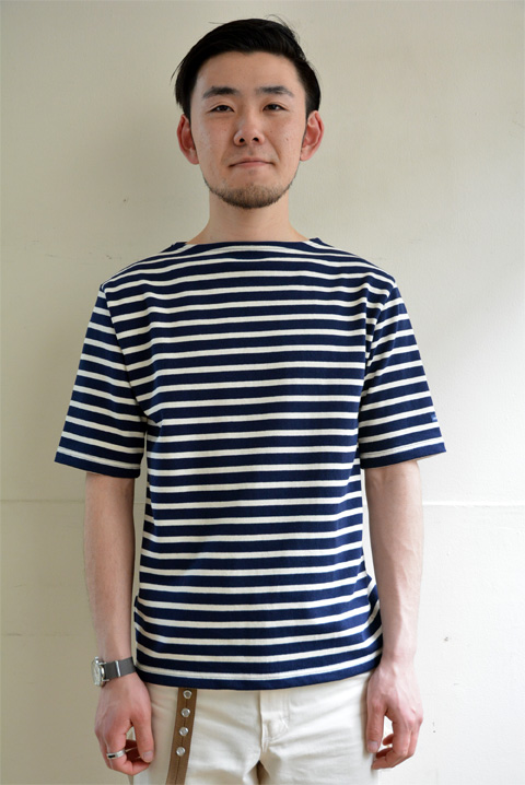いつものウエッソンと同じ生地の半袖。まずは定番のECRU×MARINE(生成り×マリン)とMARINE×ECRU(マリン×生成り)。船乗りのワークウェアだったことから脱ぎ着しやすいボートネック。生地が丈夫で愛用していくほどに身体に馴染み風合いが増していく。昔から変わらないスタンダードアイテム。
