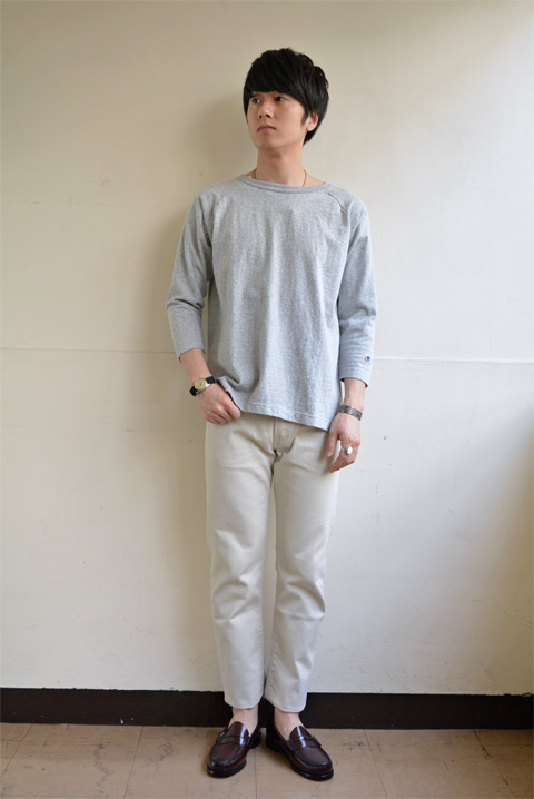 お色はオフホワイトとモスグリーンの2色でご用意させて頂きました。気取った印象は全然なく、ラコステのポロシャツなどはもちろん、気軽にTシャツで合わせても雰囲気がございます。