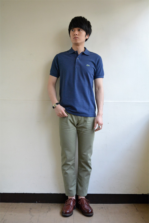 夏の定番、ラコステのポロシャツにも相性抜群。いつもラコステはサイズ3を着ていますが、パンツの綺麗なシルエットに合わせて2のサイズですっきり着てみました。