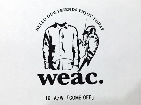 全国のweac.ファンの皆さま、大変長らくオマンたせ致しました今年もヤっちゃいます恒例の『weac. 2016AW 受注会』! 今秋冬のテーマは「COME OFF」でございます。良い意味で肩肘張らずに力が抜けた(come offした)シーズンになっているように思います。とてもRELAX感があって良いんです。「weac.」と言えばシャツを思い浮かべる方も多いと存じますが、近年ジャケットやブルゾン、コートなどのアウターやパンツ、セーター、カバンや巻き物に至るまでトータルでの展開になってございます。デザイナー杵築氏のcome off(オチのある)コレクションに是非いらしてくださいませ。