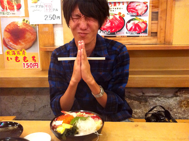 海鮮丼を頂きました。またまた北海道は小樽(写真は仲良くなったおじさんに撮ってもらいました)。