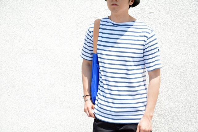 モデルのスタッフ瀬川が、ジャストサイズで着たボーダーTシャツは「セントジェームスのピリアック」。薄手の生地は、真夏まで重宝する定番アイテム。シーズンカラー「NEIGE/INDIGO(白×インディゴブルー)」は、スタッフ間でも大好評!