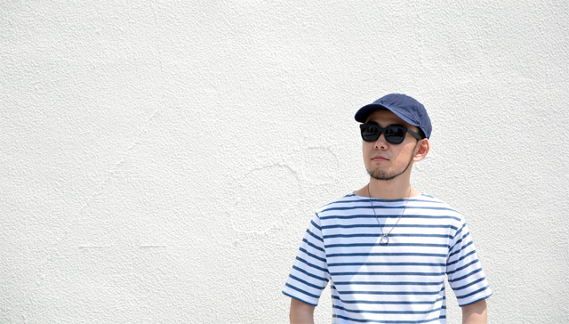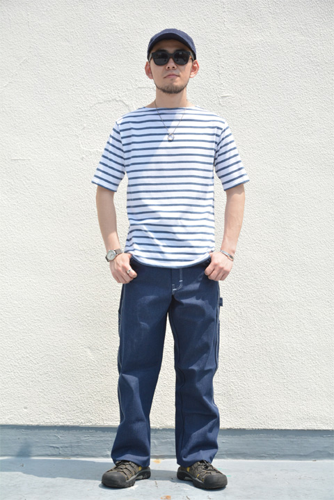 ボーダーTシャツ+太めのパンツ。