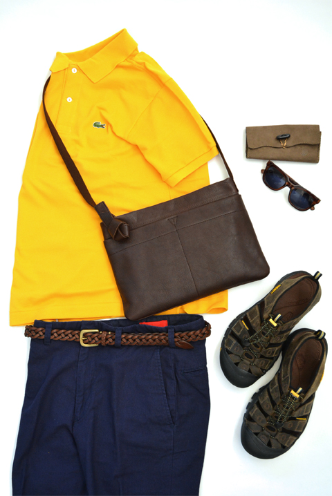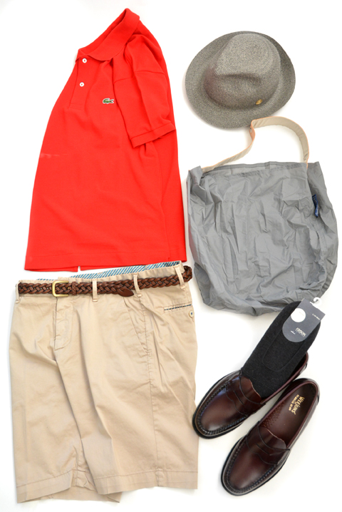 ポロシャツ×ショートパンツのスタイルは、子供っぽく(あるいはおじさんっぽく)ならないようにシルエットに気を付けて。綺麗なシルエットと素材感のショートパンツに、革靴とハットで大人っぽく。同系色のエコバッグを合わせて抜け感をプラスしました。
