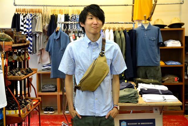 着用したのは以前ご紹介した形の「fanny pack(ファニーパック)」。おさらいですがファニーパックとは、主に米国で使われる表現で、背中で留める小袋のついたウエストバッグのことだそうでございます。