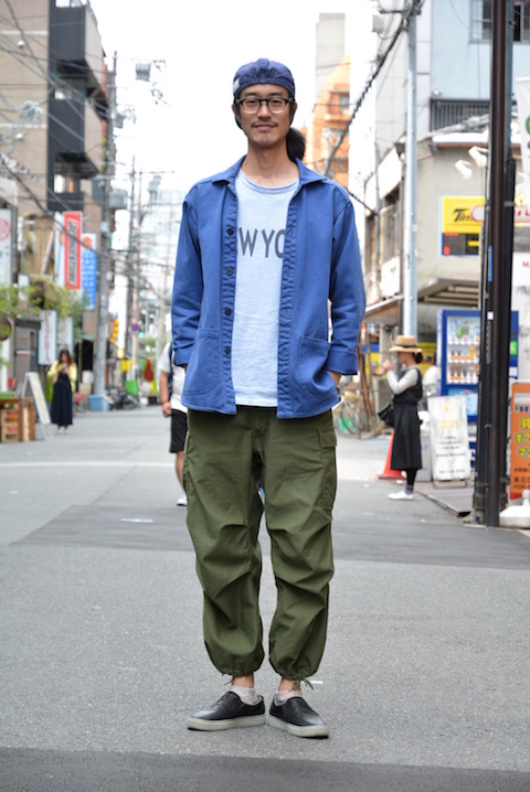 「スタッフ堀田は、ダブルツリーのネイビーのワークジャケットに、アメリカ軍の軍パン。」