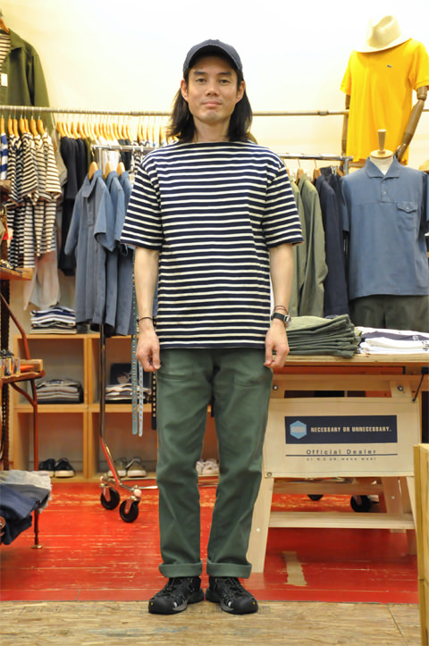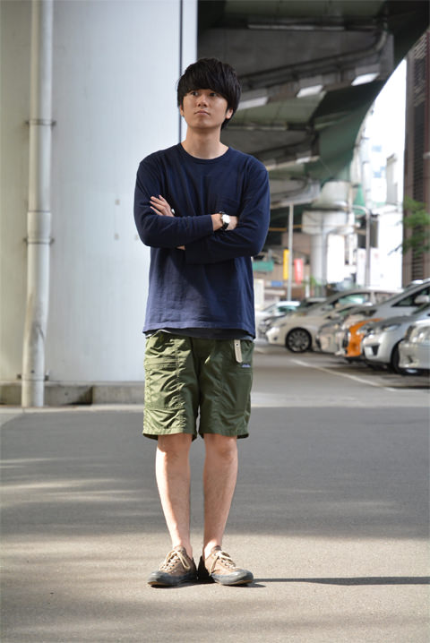 「スタッフ田口は、ネイビー×エクリュの半袖ウエッソンに、ガンホーのファティーグパンツ。」