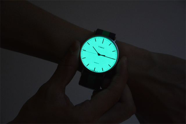 竜頭を押し込むことで文字盤の全面が発光する、TIMEX(タイメックス)お得意のインディグロナイトライトももちろん搭載。