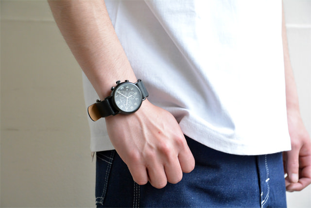 シンプルなステンレスのブラックケースに、ブラックの文字盤、落ち着いた色味のインデックスが大人っぽさを感じさせるアナログウォッチ。クロノグラフ(ストップウォッチが付いた腕時計)でありながらビンテージのミリタリーウォッチのような無骨なデザイン。