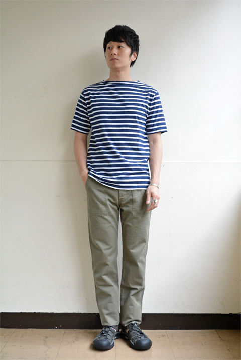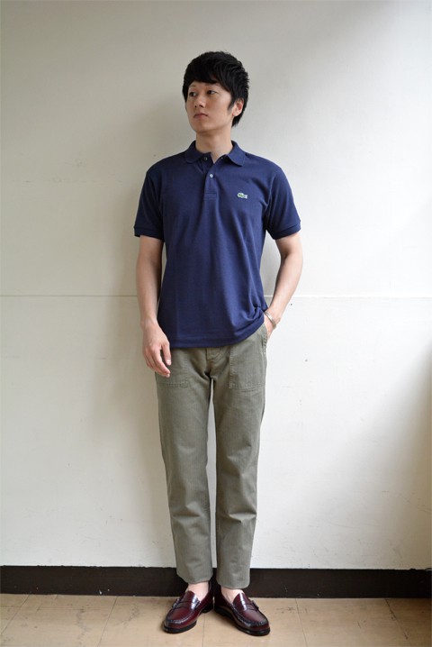 ワタクシ個人的には、オリーブのパンツにはやっぱりネイビーのトップスでしょ!!ということで、ZABOU夏の定番、セントジェームスのピリアックとラコステを合わせてみました。