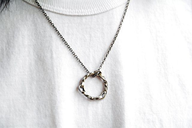 10¢のヴィンテージコインをリング状に制作し捻る。それを3枚繋ぎリング状にしたペンダントトップは、グラスホルダーとしてもご提案させて頂いてます。また、シルバーのチェーンを外して頂き、リングとしてもお楽しみ頂けます。