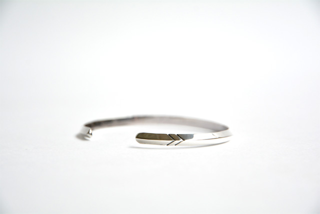 先程とはうってかわってネイティブ調のスタンプが施されバングル。ノースワークスの新しい取り組みでクラシックなネイティブスタイルが今までと違う雰囲気でまたいいですね。素材はシルバー900を使用。これは古いコインなどと同じものでまさに得意とするところですね。