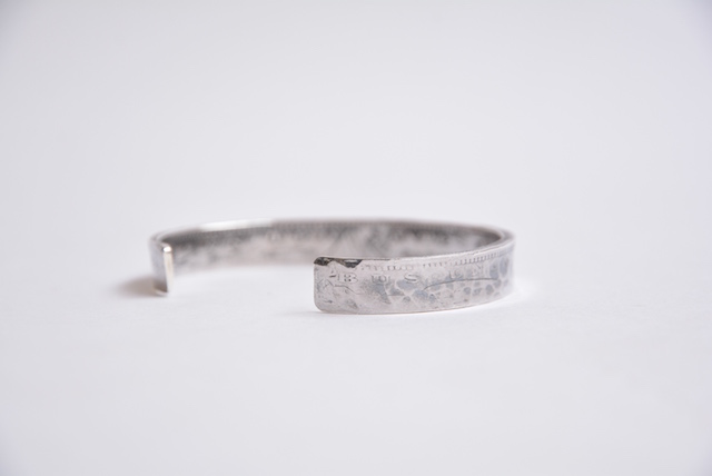 裏側にコインの文字柄を綺麗に残しつつ、表はハンマーで叩いて槌目(つちめ)模様をつけております。一見してコインと分からない遊びのきいたバングルでございます。