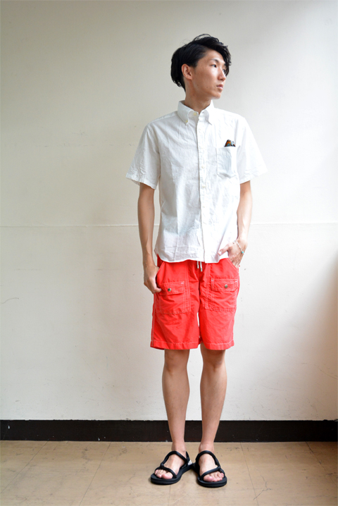 ナイロン素材のショートパンツに足元はサンダル、サングラスを胸ポケットに忍ばせて腕回りにはバングル。ちょっと夏っぽい、サーファーを意識したコーディネートを組んでみました。
