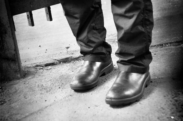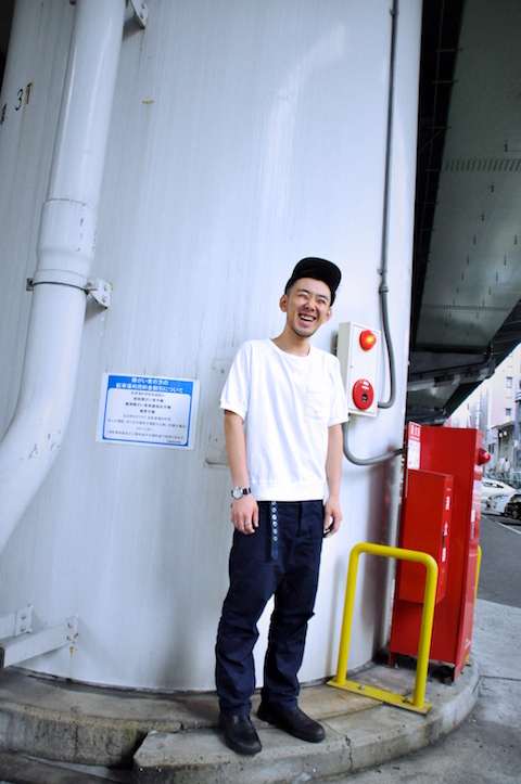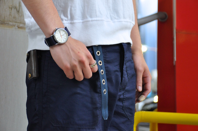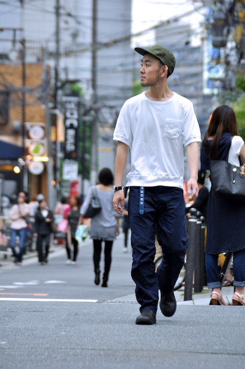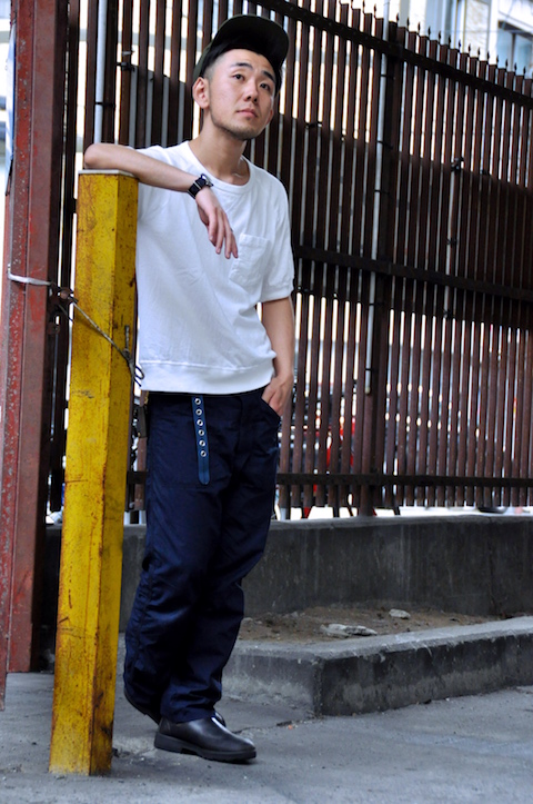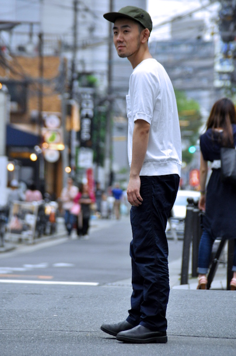 スタッフ大井はふわふわと適当に返事をすることが多いので、よく惑わされる。オリーブのキャンプキャップに白いポケットT、ワークパンツにブーツと、どこかミリタリーを思わせるスタイル。それにしても、ザボウのスタッフはネイビーとオリーブが多い。