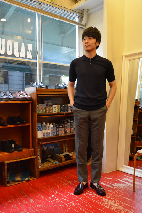 ビジネスファッション向けの洋服もご用意しております。ニットポロに、サマーウールトラウザー。大人な方にファッションを楽しんでもらう。ZABOUのミッションである『紳士をつくる』、まさに紳士な方に向けたアイテムでございます。紳士の先輩瀬川さんに着てもらいました。
