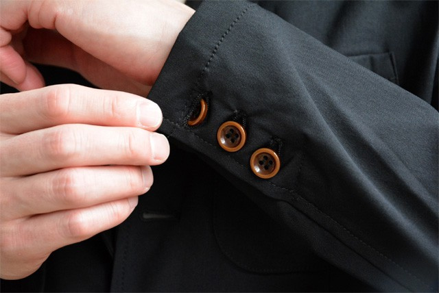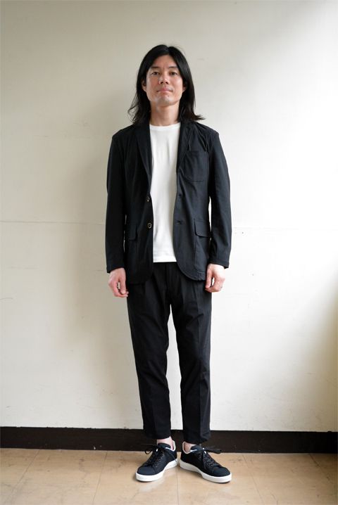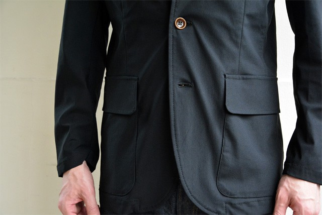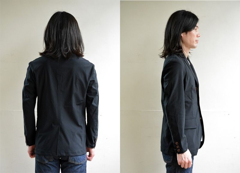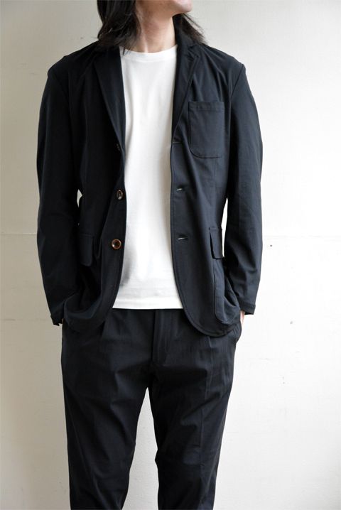 トラウザーと共生地によるジャケットは、3つ釦、スリーパッチポケットにセンターベントとトラディショナルなディティールです。もちろんシワにもなりにくい為、旅行や出張などにもおすすめの一着です。