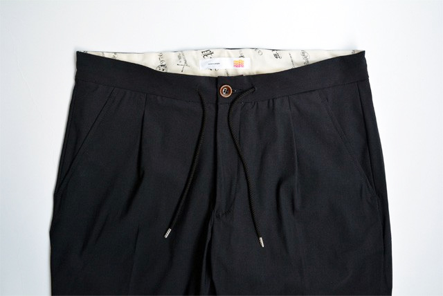 トラウザーは、1タックでスピンドル付き。腰回りに程良いルーズ感を保ちながら膝下から細くなるクロップド丈のテーパードシルエット。快適でラクチンで、でもシュッとしてクリーンな印象。これが、オン・オフ問わずお楽しみ頂けるということで皆様から大変ご好評頂いています。